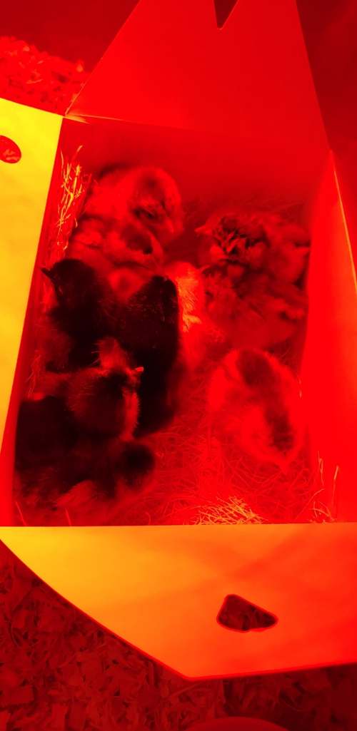 We have started them on this chick starter feed. I chose a medicated starter feed because these chicks are vaccinated for Marek’s disease, but not coccidiosis, and this feed will help protect them against a deadly GI parasite. We’ve ordered some chick grit off of amazon that will be here in a day or two to help their digestive system- chickens need grit in their diet to act as their “teeth” and help them digest food. They’re on pine bedding, which is better for their feet and legs than other types of bedding, is soft, and doesn’t upset the respiratory system as much. I also have them under a heat lamp in my homemade brooder, so that they can stay a toasty 95*F for the next 10 days.