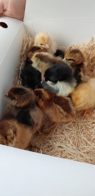 They are so adorable! We ordered 3 speckled sussex hens (and they gave us an extra one, too!), 3 buff orphingtons, 3 americaunas, and 3 black austrolorphs. We also have 3 Brahmas coming next week (one of my friends bought 6 but she only wants 3 because she lives in the burbs, and 6 is the minimum order).